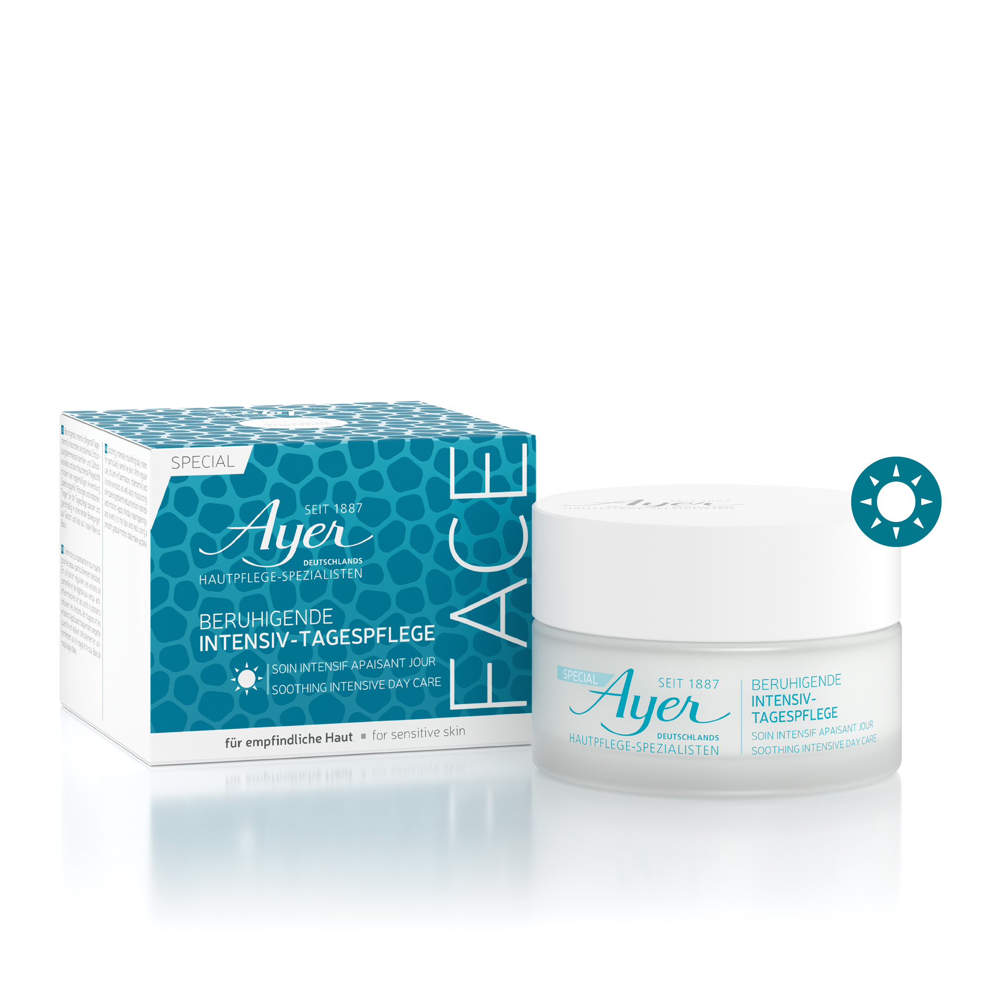 Die harmonisch ausgleichende Pflege – Lösung für das neue ICH Ihrer stark strapazierten und empfindlichen Haut heißt SPECIAL Day Cream. In der ultraleichten und optimal verträglichen AYER-Spezial- Formel sind Panthenol, entzündungshemmender Kamillen- und Süßholzextrakt und durchfeuchtende Pflegestoffe enthalten.