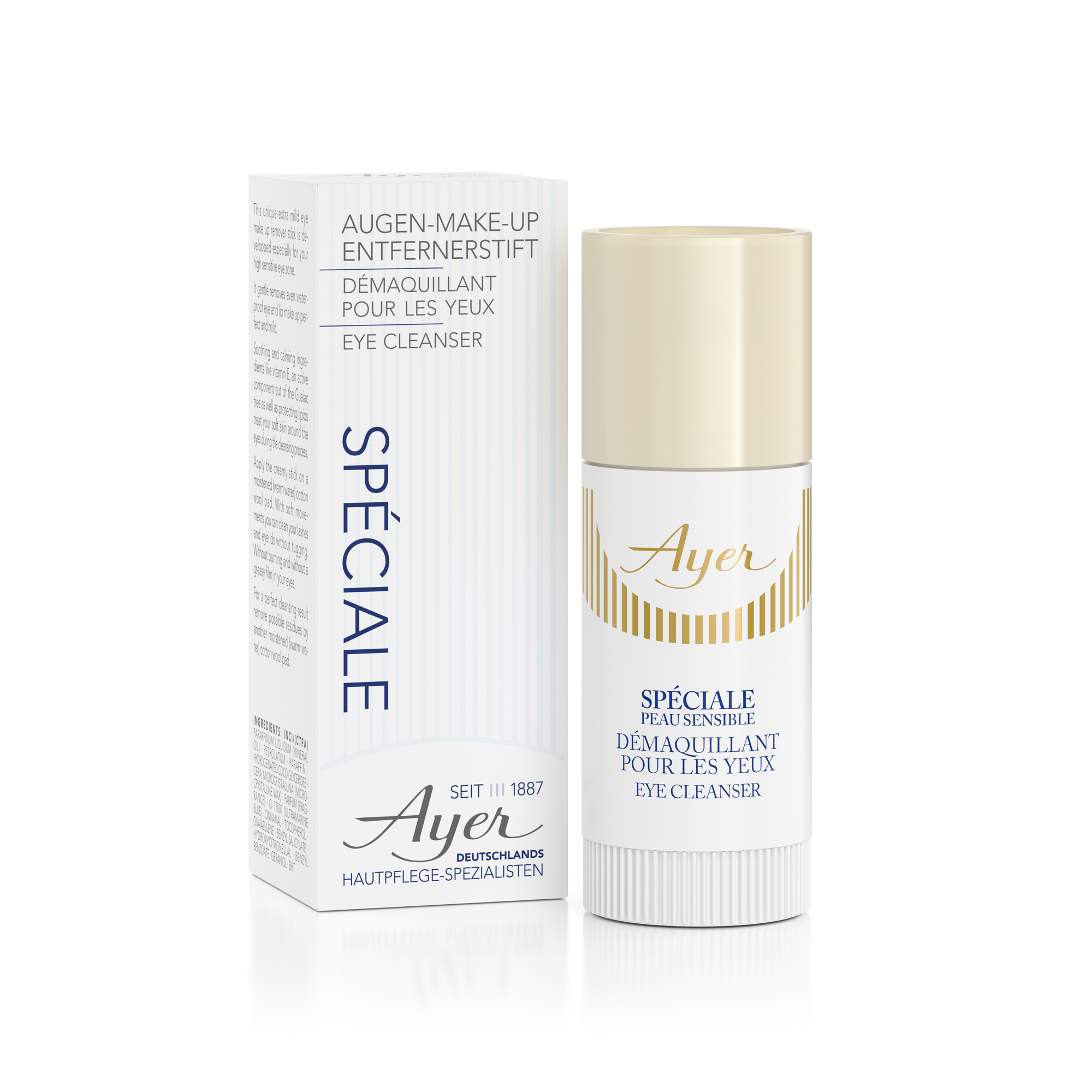 Der besänftigende Eye Cleanser Stick bereichert Ihr gewohntes Reinigungsritual und komplettiert die AYER SPECIAL -Linie für gestresste und sensible Haut.
