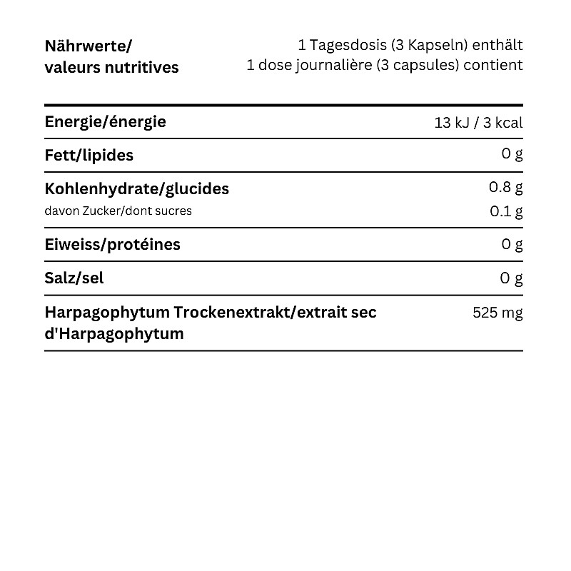 Harpagophytum Trockenextrakt 87.5 %, Laktose, Trennmittel (Magnesiumstearat und Siliciumdioxid); Kapselhülle: Hydroxypropylmethylcellulose